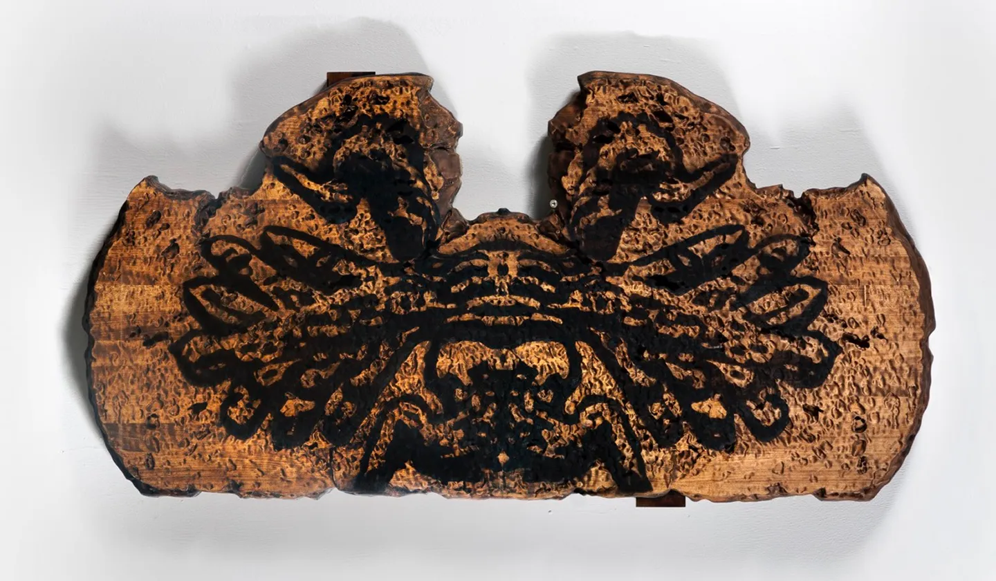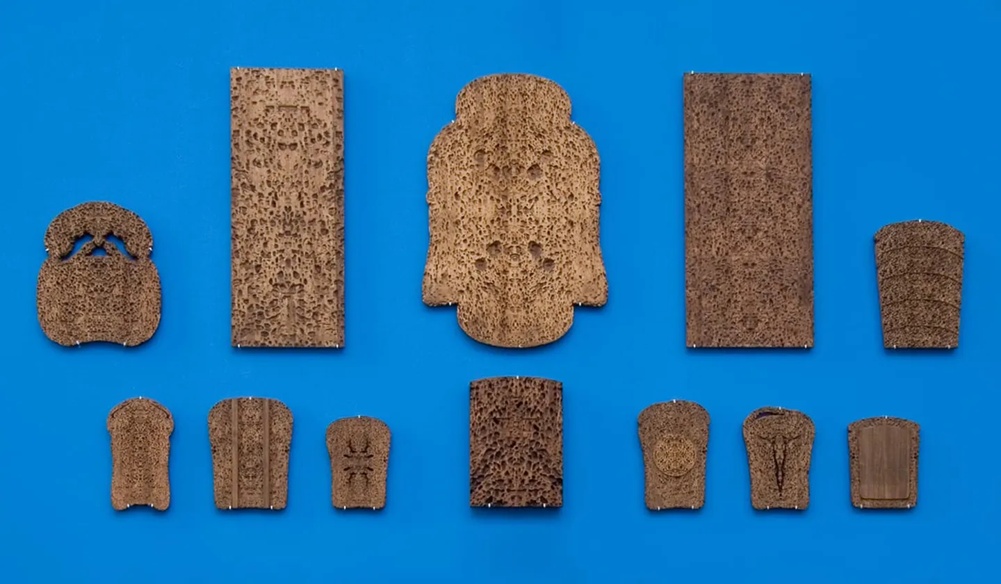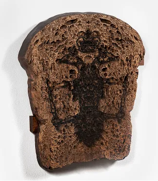 For example, Jackson Pollock was creating chaos in his works by dripping. His work (its important component) was to create an ABSOLUTELY chaotic NONFIGURATIVE image. Texture of bread originally contains this chaos. Therefore, the next step is to challenge it. The texture is duplicated, repeated (often on the central vertical axis of symmetry), what creates a "miraculous" effect - inimitable, in principle, chaotic matter is thoroughly and precisely repeated. From one point of view, this repetition "hangs" the concept of chaos. From the other point, it places the object to the category of heraldic form, which usually has a central vertical axis of symmetry. Symmetry creates a METAPHOR (an image) of an artwork as a self-contained visual object, which is creating inside its own forms its own borders - a frame.