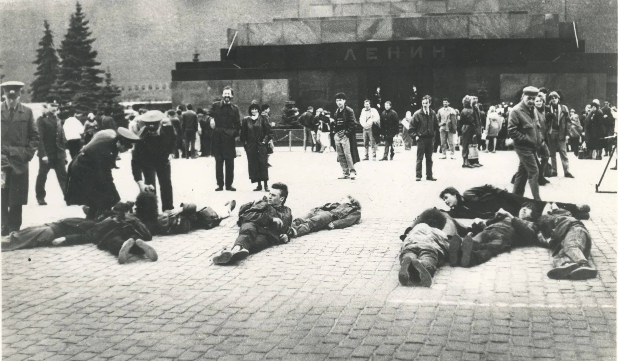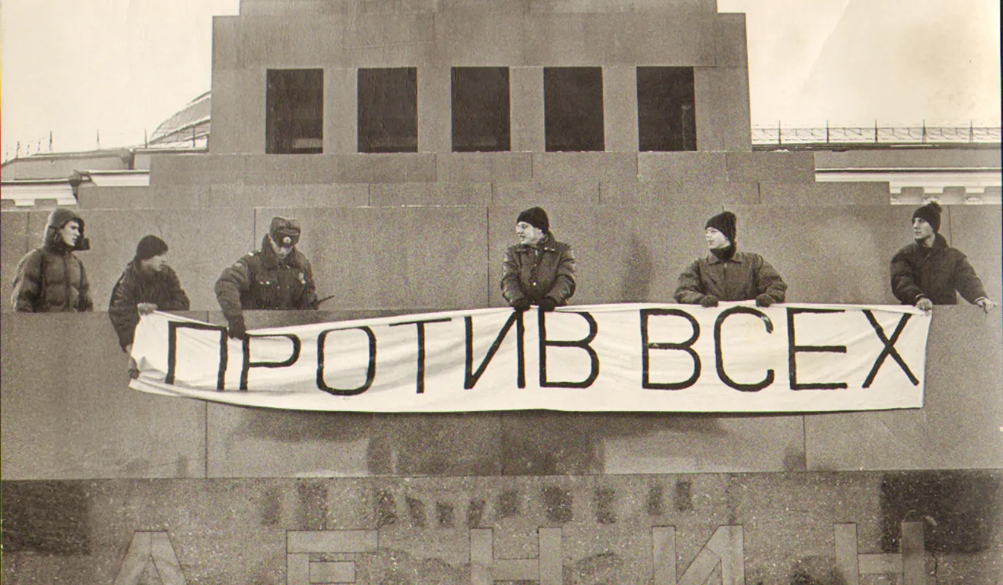 It was the time of the two most powerful actions in Russia’s art history. One was clearly educational in its nature, mimicking the historical experiences of resistance to authority – the 1998 Barricade staged on the 30th anniversary of May 68. A year later, Osmolovsky and four of his colleagues would make an action that was practically identical to the political one, if one did not know the context: they physically hanged a banner with “Against All” slogan on the tribune of Lenin’s mausoleum.Despite the differences in intentions, both actions had similar consequences: hunting down performance artists by Russia’s FSB and administrative penalties. Along with this, artists formulated a methodological distinction between art and politics in terms of “effectiveness” (singularity, exclusivity, and reversibility). Working out boundary lines was a decennial outcome of the 1990s which significantly influenced the theory of Actionism.