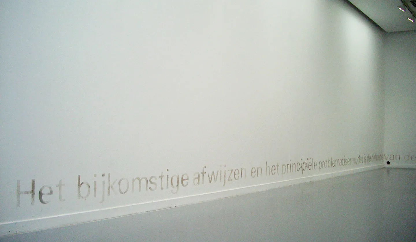 The next project in a museum space (the Museum of Contemporary Art MUHA, Antwerp) involved phrases written in dust at the bottom of walls – the seemingly ephemeral materiality of which, however, was coming into a hidden but powerful contradiction with the abstract nature of the text itself.