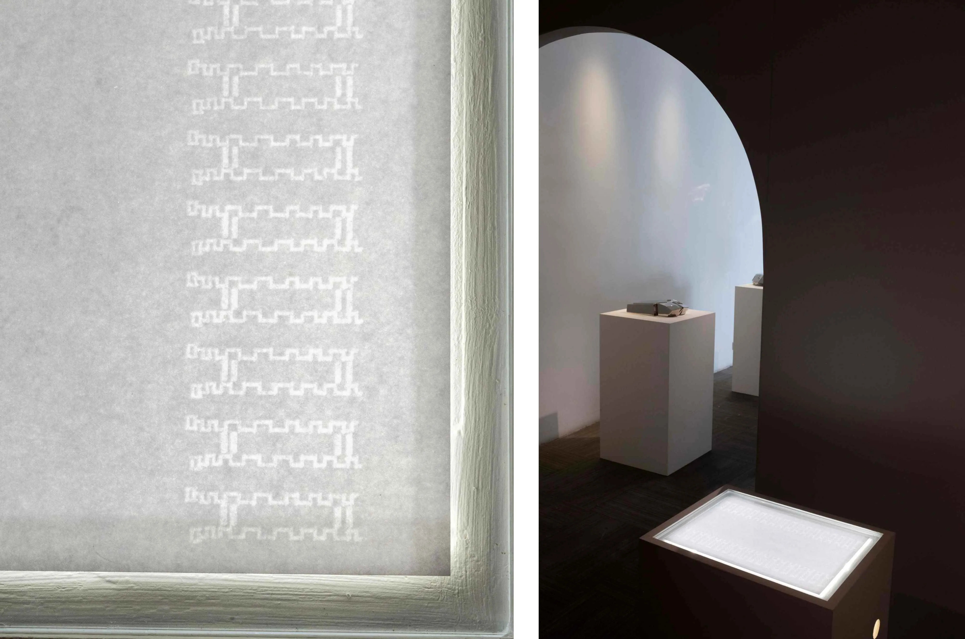 The semantics of the towers are continued by two other Osmolovsky’s series. The title of the first series, “Traces,” will make the curious viewer look closely at the blank sheets of white paper. But no matter how long you look at the blank sheet of paper lying on the table, you will see nothing. Only by lifting the paper to the light, i.e. by exposing it to the anaoid not provided for in the exhibition, one can notice the stripes of watermarks, reproducing the imprint of caterpillar tracks, which tanks leave on their way.