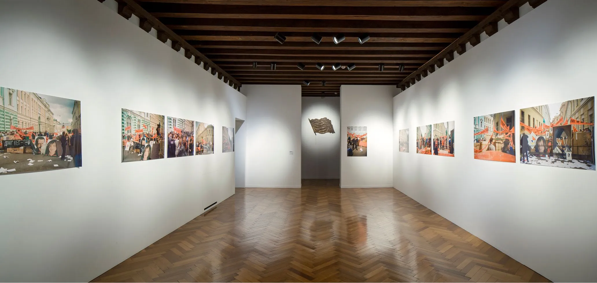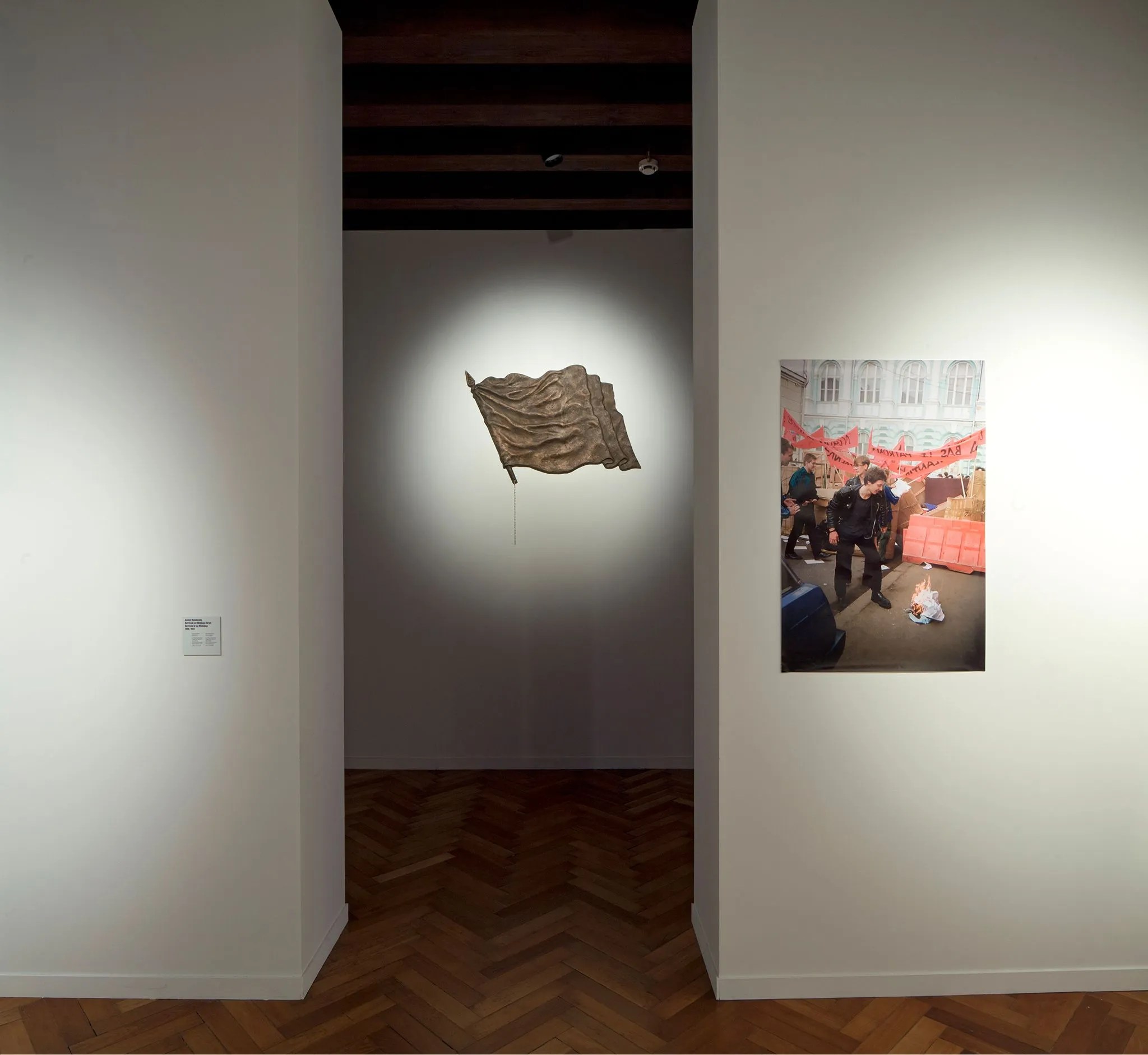 Osmolovsky, on the other hand, as this catalogue demonstrates, was represented by a fuller retrospective selection of works spanning his career of also more than two decades but these also showed a shift from more political modes of artistic practice, which was represented in the exhibition by a detailed archival display of photographs and documents of his actions, performances and important activities in publishing, to what could broadly be defined as a move to sculpture around the turn of the millennium, albeit one that is just as politically-committed as his earlier work. The Russian art scene around the fall of the USSR was turbulent, as one might expect. One off-shoot from it was ‘Moscow Actionism’, which was an often violent, nihilistic reaction to the chaotic introduction of capitalism in Russia. The period of the 1990s in post-Perestroika Russia was dominated by politically charged performances generally, and Osmolovsky was at the very forefront of these, before then applying these ideas to site-specific interventions and installations such as Monument to the Brilliant and Victorious NATO General Dr. Freud of 2000.