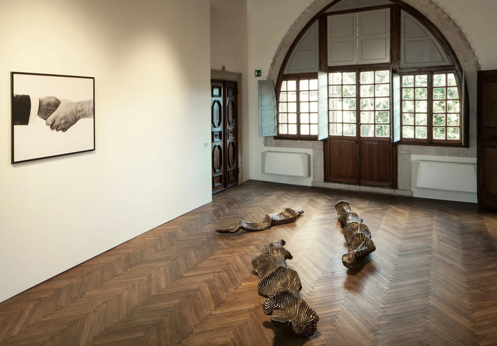 Over his roughly twenty-year career, Polish artist Paweł Althamer has constructed a singularly thoughtful and intuitive body of work - body being the operative word. Althamer originally trained as a sculptor, and despite the varying mediums he has adopted — including video, installation, and diffuse forms of social praxis — the corporeal remains at the heart of Althamer’s endeavour. The expanded nature and collaborative aspect of Althamer’s practice was reflected in the exhibition by two facets. First of all, through the video cycle So-called Waves and Other Phenomena of the Mind from 2003-4, an eight-screen installation of short films made in collaboration with Artur Z˙mijewski, showing Althamer under the influence of various substances, each of which were dispersed in various rooms of the Casa dei tre Oci and spread across all three floors. To balance this work, Althamer was also represented by Parys, a new monumental bronze cast sculpture from 2013, demonstrating his continuing engagement with this medium (which also has an often collaborative element, as in this work, which was originally an assemblage made with several pairs of hands), which was also reflected in his major installation Venetians from 2013, on view simultaneously in the Arsenale of the main Biennale.