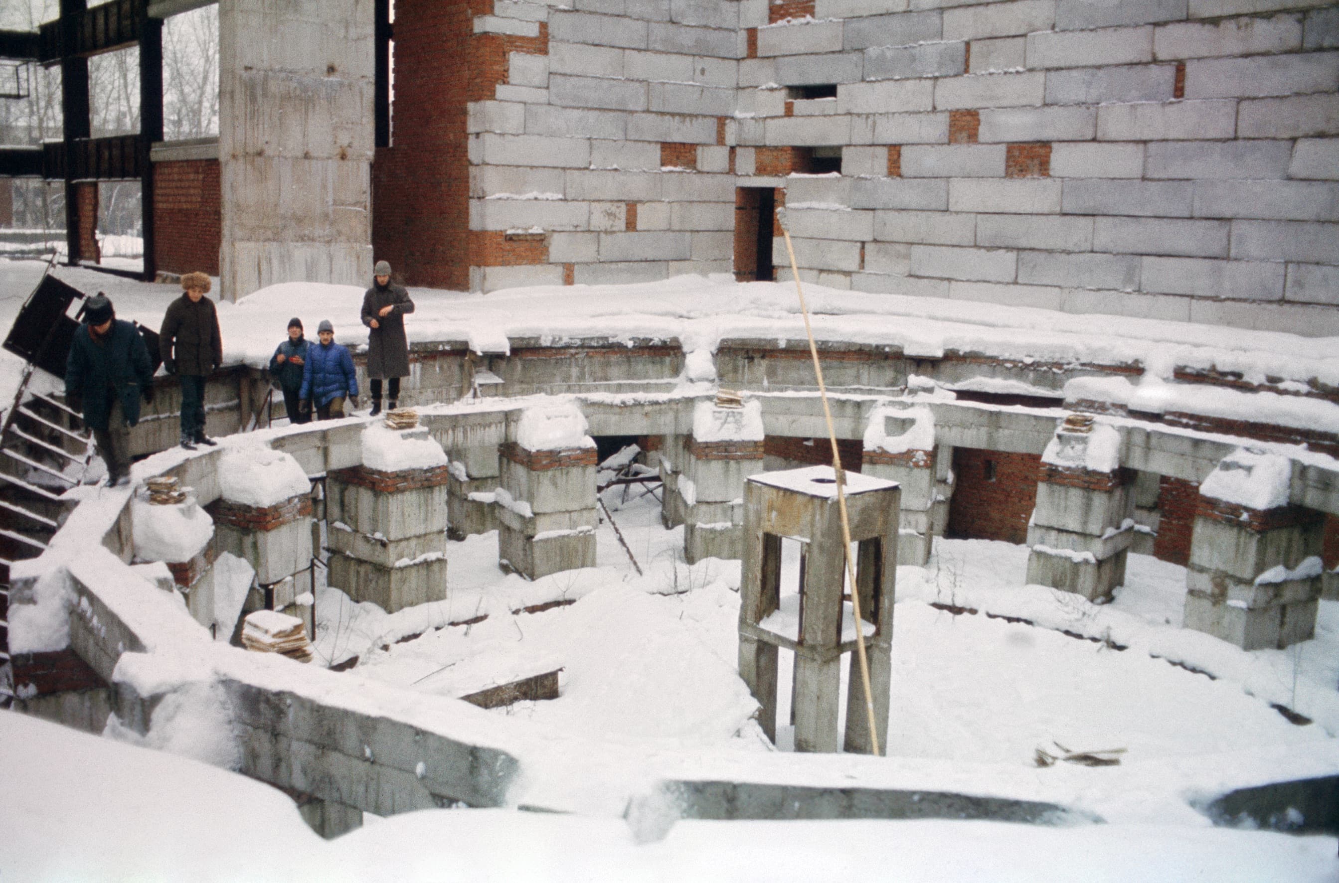 Description of the venue: in a place, where should be a scene, was the foundation pit, in the middle of which stood a large concrete column, and around 12 smaller pillars.