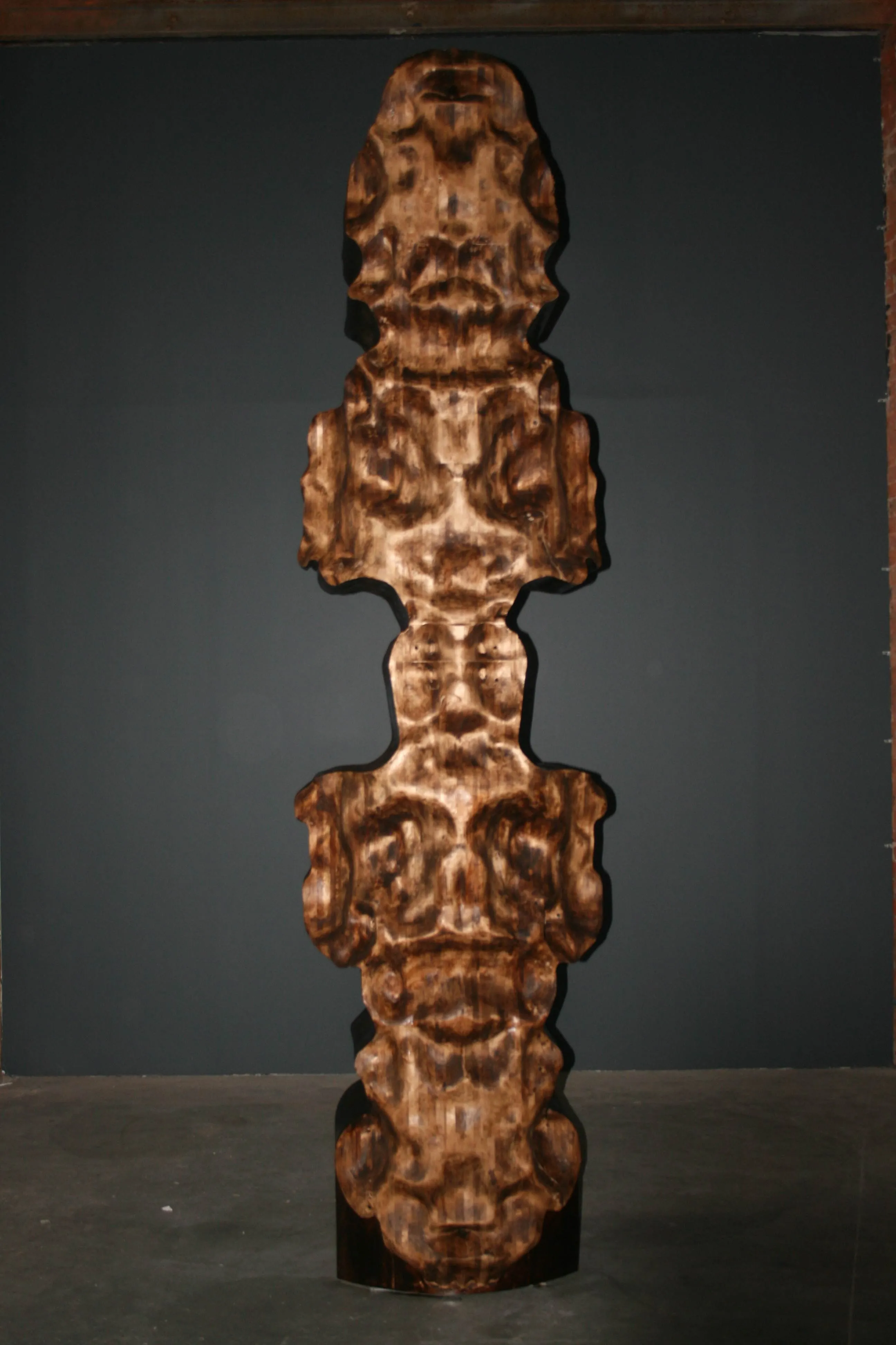 My sculpture Totem relates, on the one hand, to the modernist paradigm of art: it clearly manifests one of its fundamental principles — “the material dictates the form.” When the material is wood, the sculptural form naturally grows out of a vertical, rounded structure reminiscent of a tree trunk.