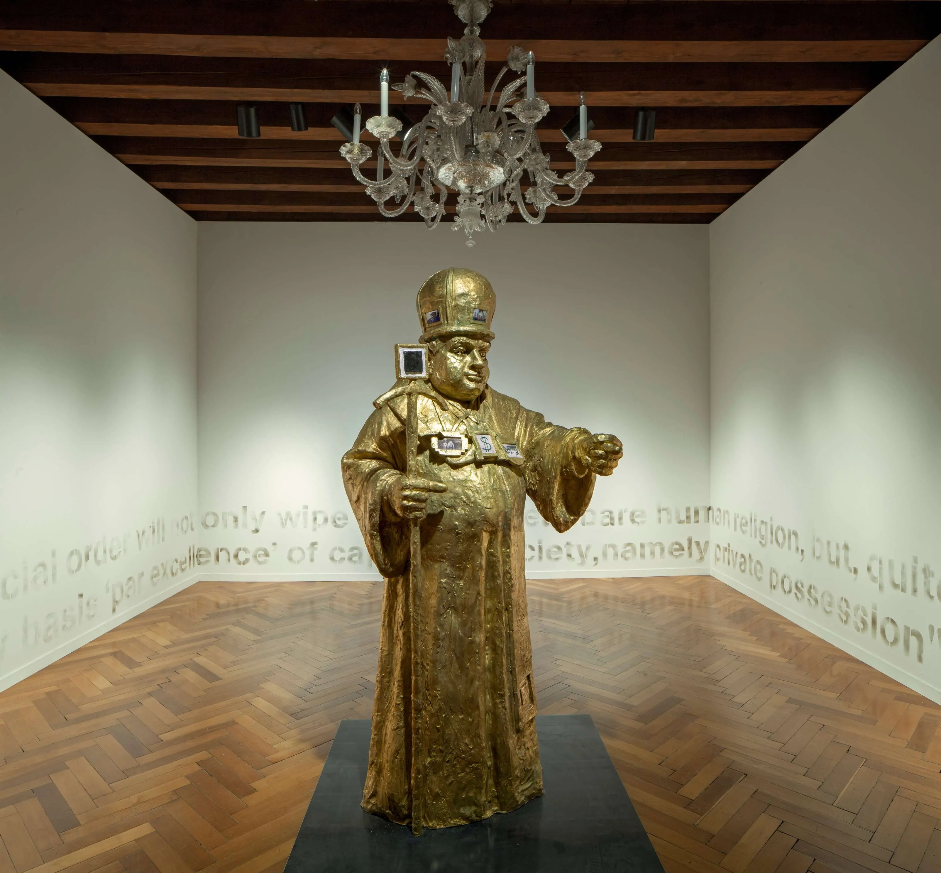 Если на выставке были представлены скульптуры, ассамбляж, видео, а также более концептуальные и политически ангажированные формы художественного творчества — от монументального до эфемерного и миниатюрного, — то это указывало на некоторые ключевые черты, лежащие в основе творчества Альтхамера и Осмоловского. Ярким примером тому служит критическое отношение к официальной религии, как, например, в раннем перформансе Альтхамера 1991 года под названием «Кардинал», который не вошел в экспозицию, и еще очевиднее — в работе, созданной Осмоловским специально для этой выставки, «Золотом автопортрете» 2013 года, где для автопортрета он выбрал облачение патриарха Русской православной церкви.